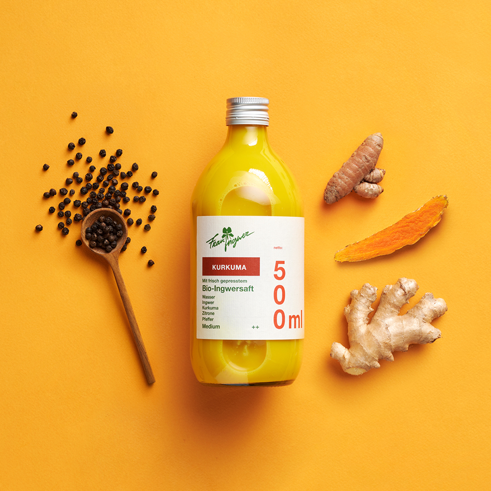 Gleiches Rezept – Neue Haltbarkeit. Unsere Neuerung ab Sommer 2021: Frau Ingwer Kurkuma mit längerer Mindesthaltbarkeitsdauer. Wir haben auf die zahlreichen Nachfragen reagiert und ein schonendes Pasteurisationsverfahren gefunden, welches unsere Produkte mit Hilfe von Kurzerhitzung länger haltbar macht. Dadurch bleiben nahezu alle Vitamine und Mineralien erhalten und gleichzeitig hast Du den Vorteil, dass Du immer eine Flasche auf Lager haben kannst – für den spontanen Frühstücksbesuch oder als Geschenk für Deine Lieben. Frau Ingwer KURKUMA mit kalt gepresstem Bio-Ingwersaft und Bio-Kurkumasaft ohne Zucker beinhaltet den puren Geschmack aus Bio-Kurkuma und -Ingwerknollen abgefüllt in eine Flasche für Dich zu Hause. Entweder pur als Ingwer-Shot, zum Mischen von kalten oder warmen Getränken sowie toll als Zutat für die nächste Kochsession.